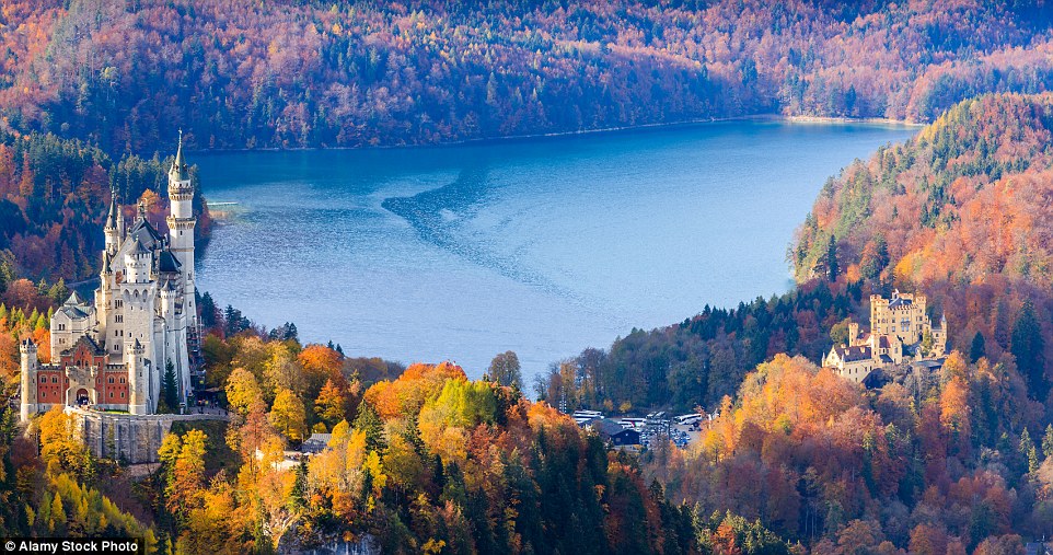Lâu đài như trong cổ tích Neuschwanstein ở Bavaria, Đức trông thật kỳ diệu khi được bao quanh bởi cây cối mùa thu.