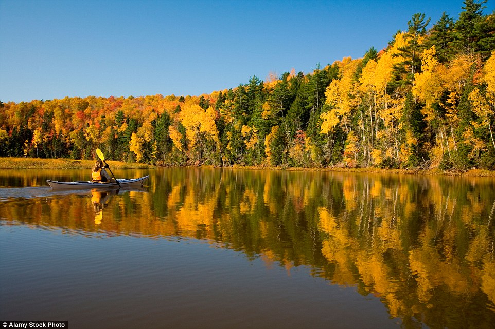 Thuê một chiếc thuyền kayak thưởng ngoạn phong cảnh dọc theo dòng sông Bonshaw trên đảo Prince Edward ở Canada, du khách sẽ thấy vẻ đẹp tuyệt vời của mùa thu phản chiếu trên mặt nước hồ trong vắt, phẳng lặng.