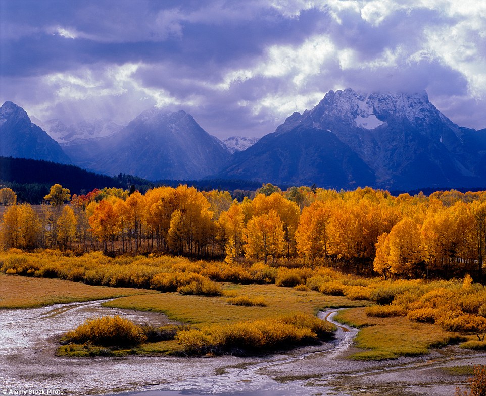 Các tia sáng mặt trời chiếu vàng rực một rừng cây dương Oxbow Bend ở Vườn quốc gia Grand Teton, Wyoming.