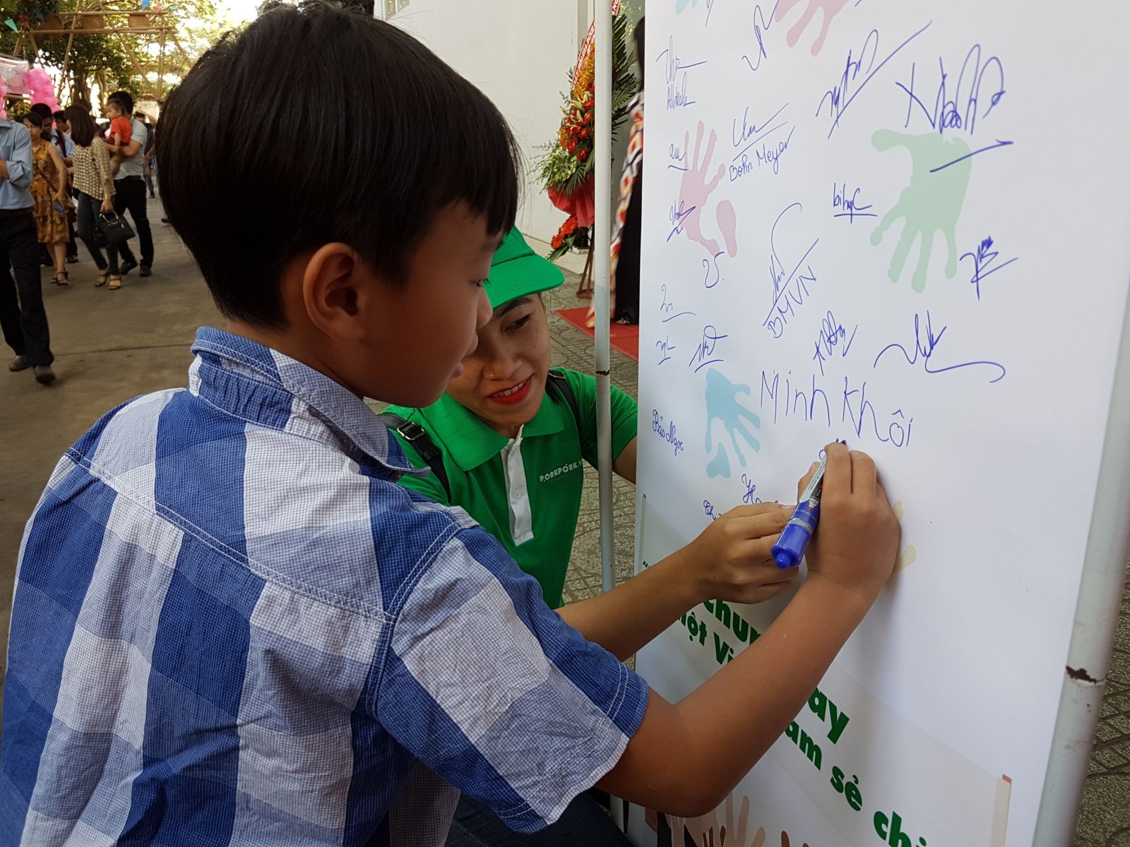 Nhiều bạn nhỏ cùng ba mẹ đến tham gia ngày hội cũng rất thích thú và tự hào khi ký tên cam kết không lãng phí thức ăn