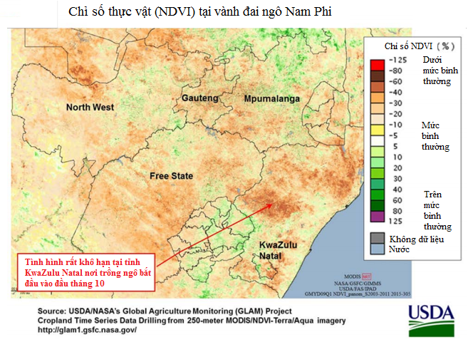 USDA dự báo sản lượng ngô niên vụ 2015/16 của Nam Phi đạt 12,75 triệu tấn, giảm 0,75 triệu tấn so với dự báo tháng trước nhưng tăng 1,95 triệu tấn so với sản lượng năm ngoái. Diện tích ngô dự báo đạt 3,0 triệu ha, giảm 200.000 ha so với dự báo tháng trước và giảm 48.000 ha so với năm ngoái. Năng suất ngô dự báo đạt 4,25 tấn/ha, thấp hơn 2,5% so với xu hướng chung trong 10 năm qua. Điều kiện thời tiết cho niên vụ sắp tới dự báo bình thường.