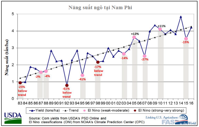 Dự báo hiện tượng El Nino cường độ mạnh trong vụ ngô 2015/16 với mô hình nhiệt độ bề mặt nước biển cho thấy chỉ số nóng trên đại dương (Oceanic Nino Index/ONI) sẽ đạt đỉnh ở thời điểm gần cuối tháng 01/2016. Điều kiện El Nino mạnh qua chỉ số ONI có thể làm giảm năng suất ngô tại Nam Phi nếu hạn hán xảy ra giữa tháng 1 và tháng 3/2016 trong giai đoạn thụ phấn và kết hạt. Trong 33 năm qua, điều kiện thời tiết El Nino từ cường độ mạnh đến rất mạnh đã làm giảm năng suất ngô tại Nam Phi xuống dưới mức trung bình từ 17-61%.