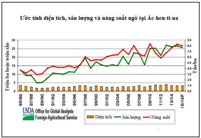 USDA dự báo sản lượng ngô niên vụ 2015/16 của Ác-hen-ti-na đạt 25,6 triệu tấn, tăng 1,6 triệu tấn so với dự báo tháng 10 nhưng giảm 0,9% so với niên vụ trước. Diện tích ngô ước đạt 3,2 triệu ha, tăng 0,2 triệu ha so với dự báo tháng trước nhưng không thay đổi so với năm ngoái. Năng suất ngô ước đạt 8,0 tấn/ha, không thay đổi so với dự báo tháng trước nhưng giảm 3,4% so với năm ngoái.