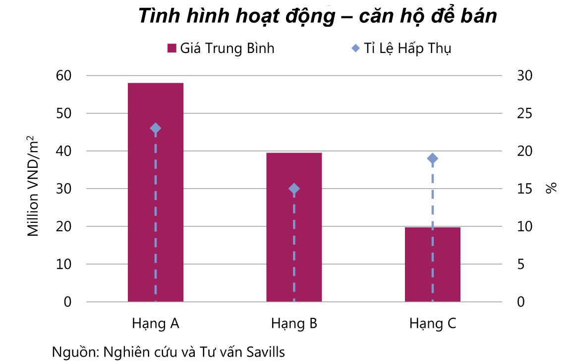 Kết quả nghiên cứu của Savills Việt Nam cho thấy, tại phân khúc này, căn hộ hạng A có tỷ lệ hấp thụ cao nhất, với 23%. Số lượng giao dịch của căn hộ hạng C tăng nhẹ 7% theo quý trong khi hạng A giảm -34% và hạng B giảm 32% theo quý.