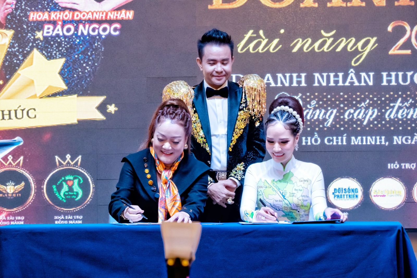Ký kết hợp đồng tài trợ giữa Hoàng Mi Collection NTK Oanh Phan và Trưởng BTC Hoa khôi Bảo Ngọc