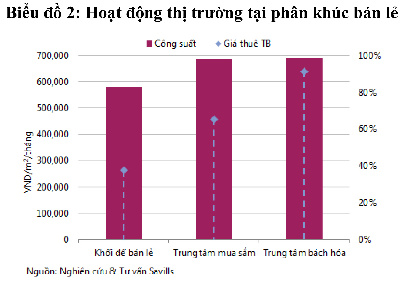 Tại phân khúc bán lẻ, trong quý III/2015, nguồn cung thị trường bán lẻ đạt khoảng 167.000m², ổn định theo quý. Tuy nhiên, giá thuê trung bình tăng 7%, nguyên nhân là do hai trung tâm thương mại Vincom Ngô Quyền và Indochina Riverside Tower có giá thuê bình quân cao hơn. Bên cạnh đó, công suất thuê ở Hoàng Anh Gia Lai Lake View và siêu thị Nguyễn Kim Đà Nẵng tăng lên dẫn tới việc công suất thuê trung bình tăng 1 điểm phần trăm (%) theo quý (Biểu đồ 2).