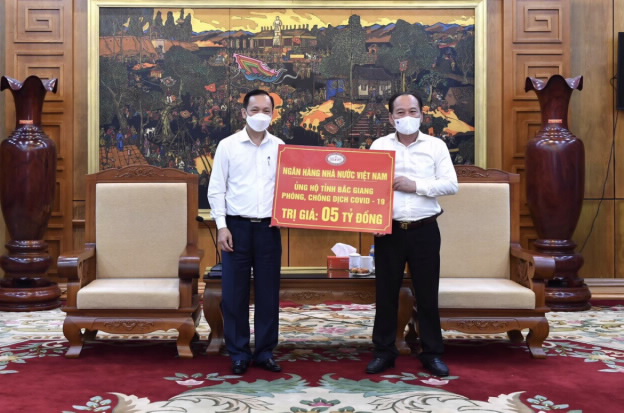 Hưởng ứng lời kêu gọi của các đồng chí lãnh đạo Đảng, Nhà nước, của Chủ tịch Nước Nguyễn Xuân Phúc, Thủ tướng Chính phủ Phạm Minh Chính, ngày 01/6/2021, Ngân hàng Nhà nước Việt Nam đã tổ chức Đoàn công tác trao ủng hộ phòng, chống dịch bệnh Covid-19 cho hai tỉnh Bắc Ninh và Bắc Giang mỗi tỉnh 5 tỷ đồng. Đây là tình cảm và sự sẻ chia của cán bộ, người lao động ngành Ngân hàng đối với những khó khăn mà hai tỉnh đang phải đối mặt, cũng như chung tay cùng hai tỉnh trong công tác vừa phòng, chống dịch bệnh Covid-19, vừa đẩy mạnh hoạt động sản xuất – kinh doanh, phát triển kinh tế.