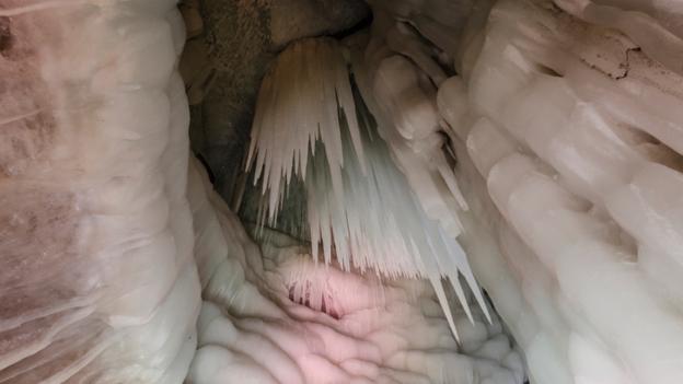 Toàn bộ hang động được bao phủ bởi nước đóng băng. Thạch nhũ chảy dài xuống từ trần hang, và các ngọn măng đá băng nhô lên từ dưới tạo nên một vẻ đẹp khó tả.