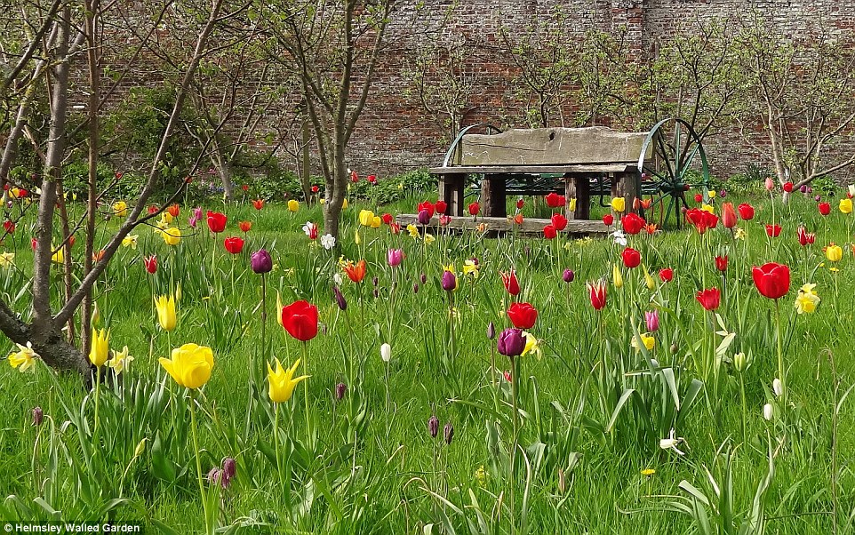 Có một vài điểm để thưởng thức bên trong vườn như vườn Physic. Hình trên là một bãi cỏ đầy hoa tulip nhiều màu sắc.