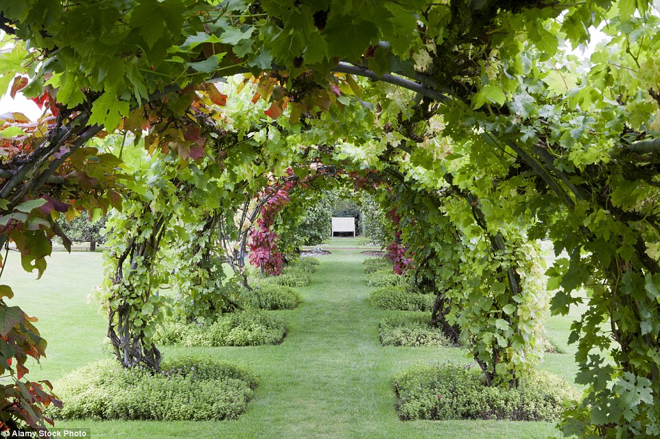 Vòm cây nho (ảnh vào cuối mùa hè) trong vườn tại Lâu đài Powis, nơi du khách có thể đi dạo dưới bóng râm để tránh nắng.