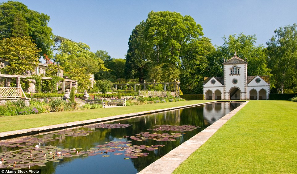 The Pin Mill và Water Lilly Pond ở Vườn Bodnant, Clwyd mà hai bên là những bãi cỏ được cắt tỉa cẩn thận (hình trên)