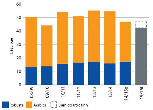 Theo Rabobank, có 3 kịch bản về sản lượng cà phê Brazil niên vụ 2015/16. Kịch bản thứ nhất ở mức trung gian, ước tính sản lượng cà phê Brazil năm nay vào khoảng 45 triệu bao cùng với thiếu hụt 5,1 triệu bao cà phê trong niên vụ 2014/15 (4,7 triệu bao cà phê arabica và 0,4 triệu bao cà phê robusta).