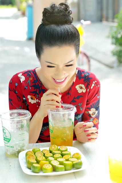 Có vẻ trà tắc là món khoái khẩu của Hiền Mai. Cô uống một hơi hết ly trà tắc Bin Ben.