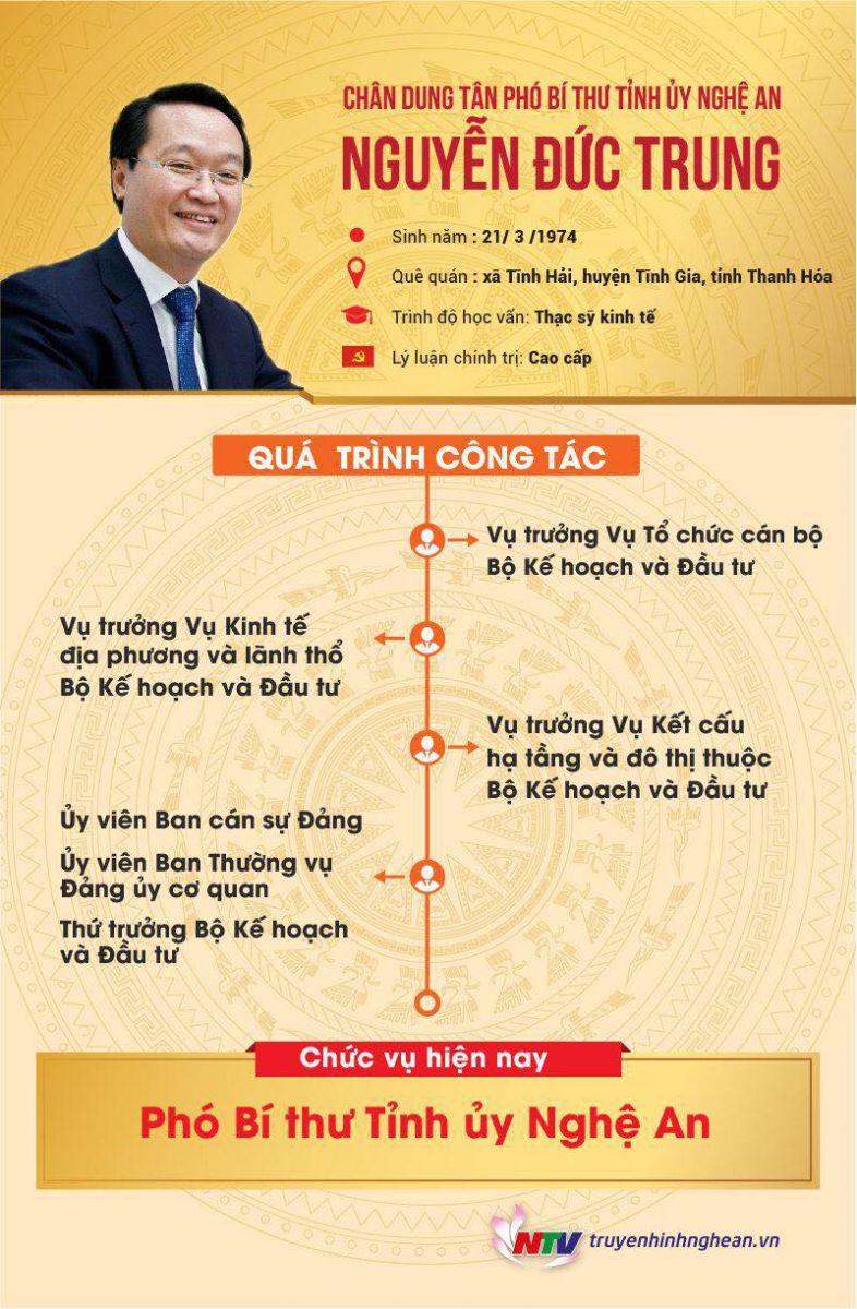 Ông Nguyễn Đức Trung sinh năm 1974, quê quán tại Tĩnh Gia, Thanh Hóa, trình độ chuyên môn Thạc sĩ Kinh tế.
