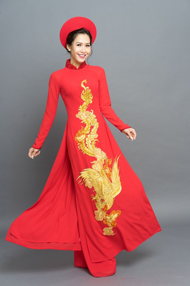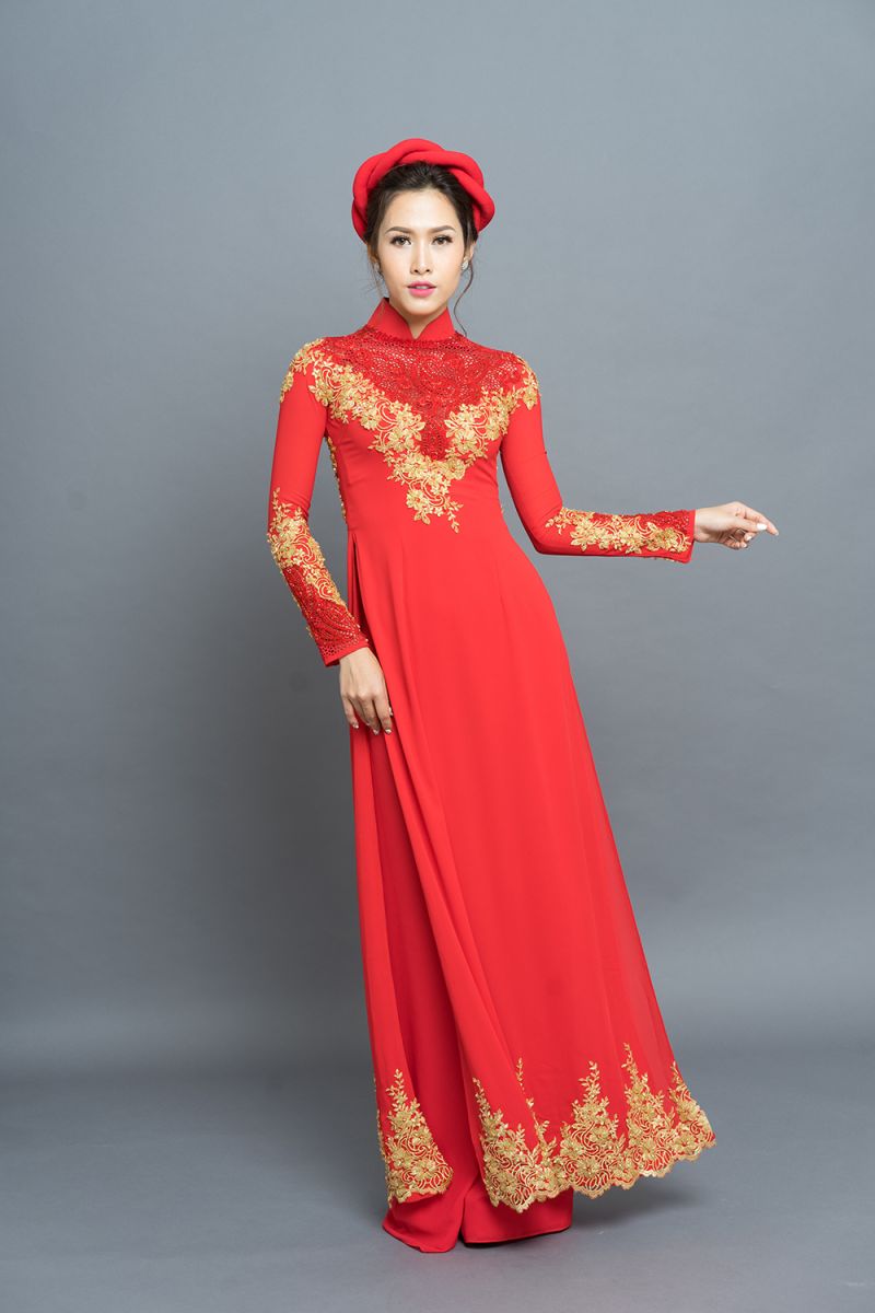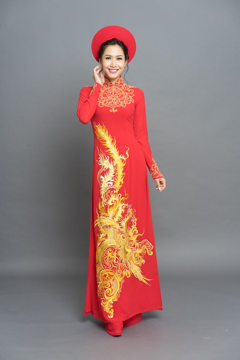 Chân dài vẫn khoe được vẻ đẹp hiện đại trong trang phục áo dài đậm chất truyền thống của thương hiệu áo dài Long Phụng. Cô dâu sẽ tự tin hơn trong ngày cưới với áo dài đỏ thêu họa tiết rồng phụng.
