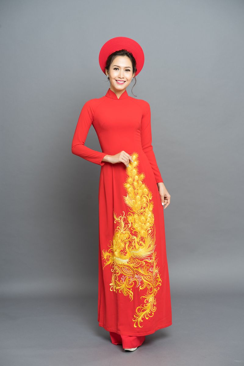 Áo dài hình chim công vàng óng ánh nhẹ nhàng kết hợp với màu đỏ của tà áo đã mang lại nét duyên cho Hoa hậu Phan Thu Quyên.