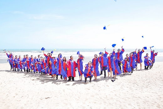 Hình ảnh cô cùng bạn bè trong lớp nhận bằng trong khán phòng của buổi bế giảng được tổ chức long trọng tại địa danh du lịch Long Hải.