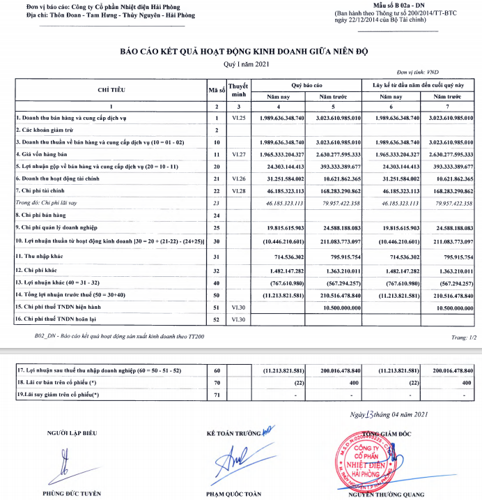 Báo cáo tài chính quý I/2021 được Công ty cổ phần nhiệt điện Hải Phòng công khai. Ảnh: HND