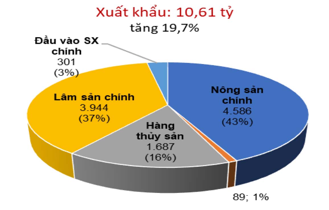 Tính chung quý I, kim ngạch xuất khẩu nông, lâm, thủy sản ước đạt 10,61 tỷ USD, tăng 19,7% so với quý I/2020. Trong đó, xuất khẩu nhóm nông sản chính ước đạt 4,59 tỷ USD, tăng 10,2%; lâm sản chính đạt 3,94 tỷ USD, tăng 41,6%; thủy sản ước đạt 1,69 tỷ USD, tăng 3,3%; chăn nuôi ước đạt 89 triệu USD, tăng 34,7%.