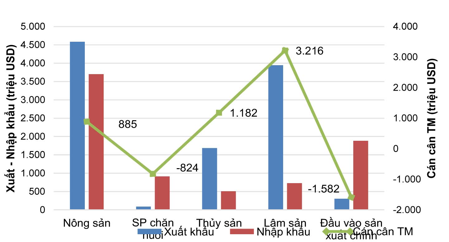 Theo báo cáo, trong quý I/2021, tổng kim ngạch xuất nhập khẩu hàng nông, lâm, thủy sản ước đạt 18,34 tỷ USD, trong đó xuất khẩu đạt khoảng 10,61 tỷ USD, tăng 19,7% so với cùng kỳ năm 2020; nhập khẩu ước khoảng 7,74 tỷ USD, tăng 44,7%; xuất siêu khoảng 2,87 tỷ USD, giảm 18,2% so với cùng kỳ năm ngoái. Cụ thể như sau: