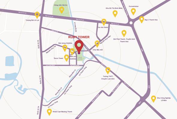 Dự án nằm ngay cạnh chợ Tân An, chợ Vườn Hoa, chung cư Tecco, trường mầm non Vietkids, chợ đầu mối…thông qua các tuyến đường huyết mạch như Lạc Long Quân, Lê Thánh Tông, Tống Duy Tân, Nguyễn Duy Hiệu…Có thể nói chung cư Ruby Tower đáp ứng tốt nhu cầu đi lại với hầu hết các điểm lân cận cho những cư dân bận rộn, cần sự kết nối vùng thuận tiện nhanh chóng.