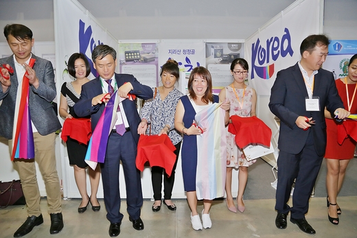 Sáng nay, bà Quỳnh Châu đại diện công ty Rừng Nho cùng các doanh nghiệp Hàn Quốc cùng nhau cắt băng khai trương gian hàng tại Hội chợ triển lãm.