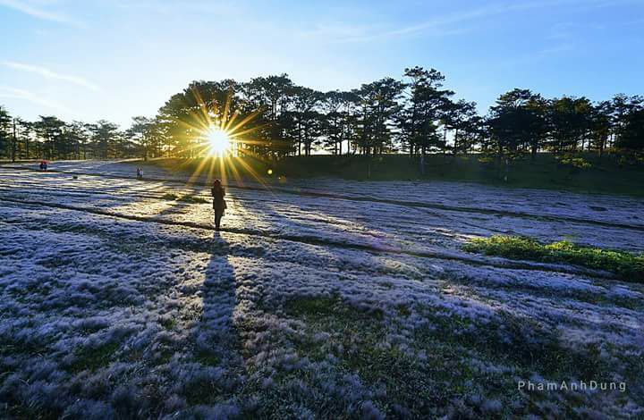 Sáng sớm lúc còn sương, bạn có thể chiêm ngưỡng vẻ đẹp trắng xóa của cỏ hồng như những bông tuyết đang trải thảm trên mặt đất.