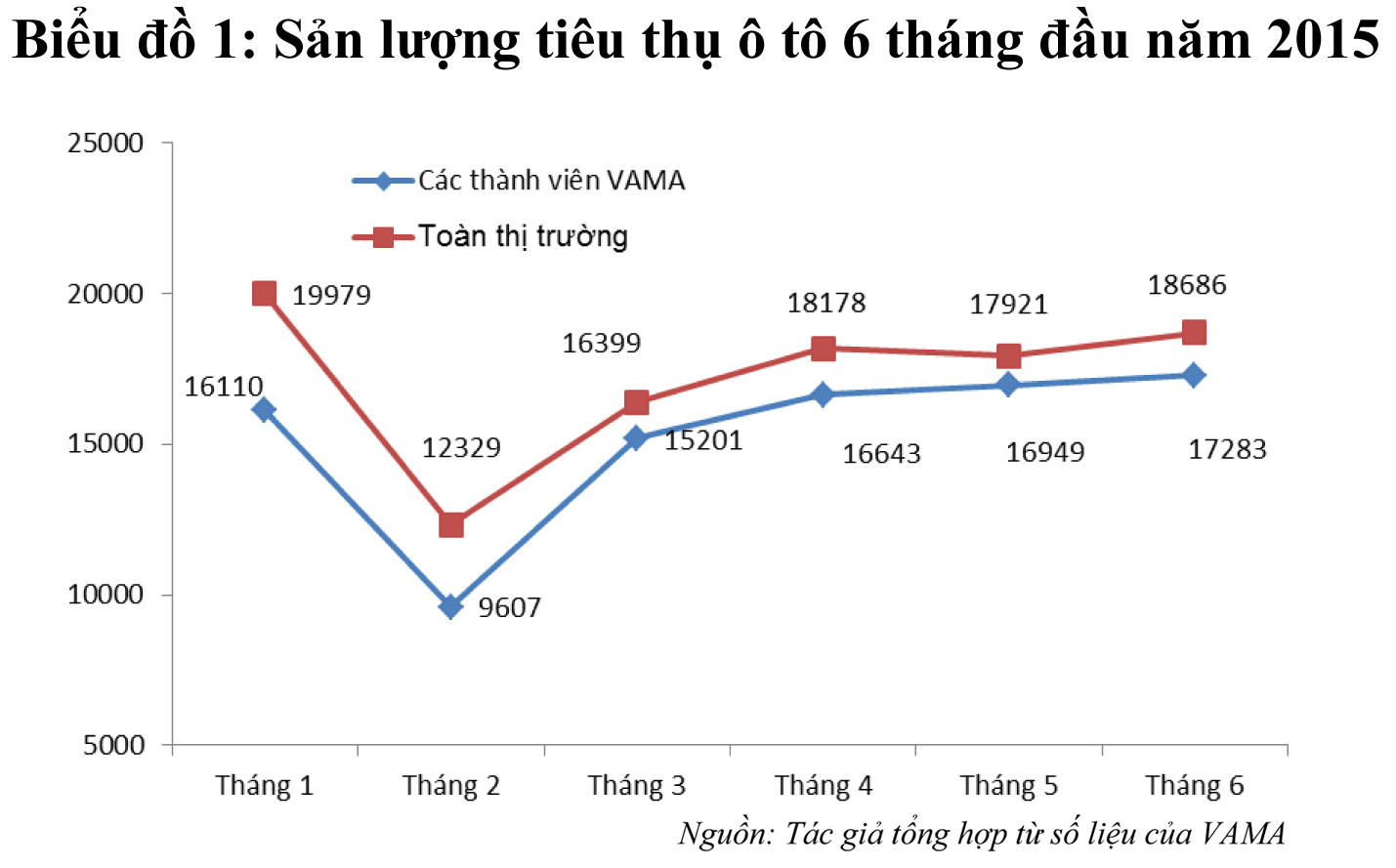 Theo đó, trong 6 tháng đầu năm 2015, sản lượng tiêu thụ của toàn thị trường trong tháng 6 đạt mức cao nhất, ngoài trừ tháng 01/2015 (tháng cao điểm đối với doanh số tiêu thụ xe của cả năm). Tuy nhiên, nếu nhìn vào doanh số tiêu thụ của các thành viên của VAMA lại cho thấy, đây là mức tiêu cao nhất trong 6 tháng đầu năm 2015 (Biểu đồ 1).