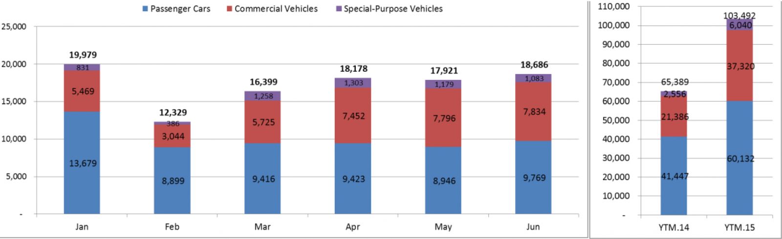 Cụ thể là: tháng 06/2015, doanh số bán hàng của toàn thị trường đạt 18.686 xe, giảm 4% so với tháng 05/2015 và tăng 57% so với tháng 06/2014. Trong đó, sản lượng tiêu thụ xe du lịch đạt 9.769 chiếc, giảm 9,2%; xe thương mại đạt 7.834 chiếc, tăng 0,5% và xe chuyên dụng đạt 1.083 chiếc, giảm 8,1% so với tháng 05/2015. Trong khi đó, sản lượng của xe lắp ráp trong nước tháng 06/2015 đạt 14,448 xe, tăng 3% so với tháng trước và số lượng xe nhập khẩu nguyên chiếc là 4,238 xe, tăng 9% so với tháng trước.