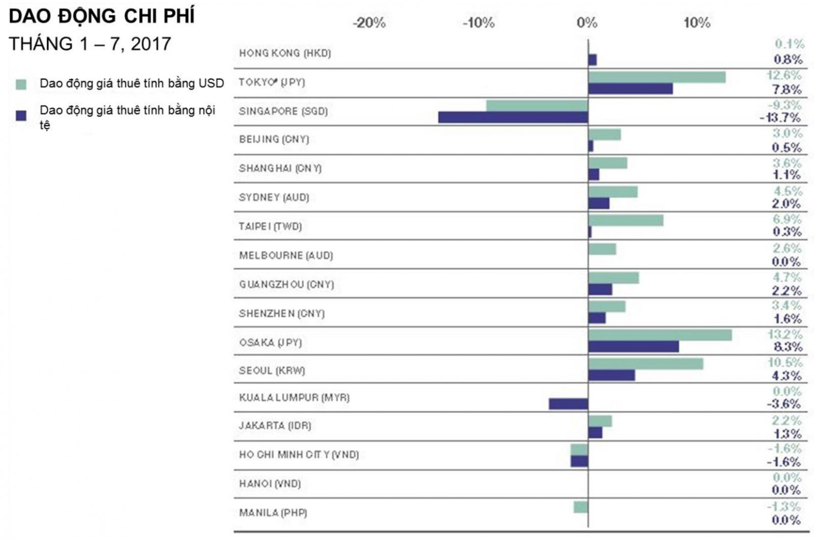 Cụ thể là, tại khu vực châu Á – Thái Bình Dương, thị trường bán lẻ dao động từ -13.7% ở Singapore đến +8.3% ở Osaka, Nhật Bản. Số lượng khách du lịch Trung Quốc và Hàn Quốc đến Nhật Bản tăng mạnh đã thúc đẩy sự phát triển của ngành bán lẻ nơi đây. Tình hình hoạt động của thị trường Singapore giảm mạnh do nguồn cầu ngày càng bị ảnh hưởng tiêu cực bởi sự phát triển chóng mặt của ngành bán lẻ trực tuyến (Biểu đồ).
