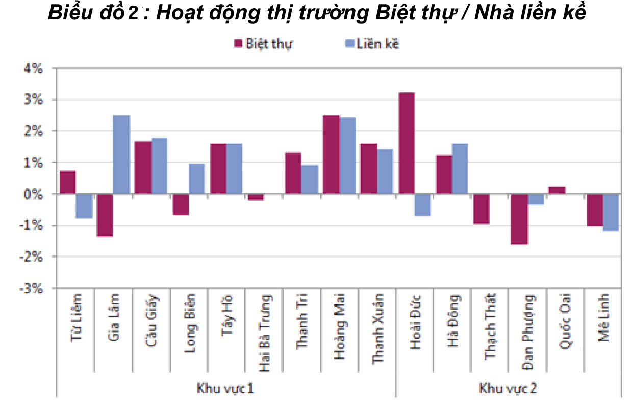 Trong phân khúc này, căn hộ liền kề đang được các nhà đầu tư quan tâm hơn. Điều này đã làm cho giá của căn hộ liền kề tăng lên trong quý IV/2015. Cụ thể là, giá căn hộ liền kề tăng 3% theo quý và 2,5% theo năm, ngược lại giá biệt thự giảm -1,4% theo quý và -2% theo năm. Quận Thanh Xuân có giá biệt thự sơ cấp trung bình cao nhất (184 triệu đồng/m²); trong khi Quận Cầu Giấy có giá nhà liền kề sơ cấp trung bình cao nhất (139 triệu đồng/m²).