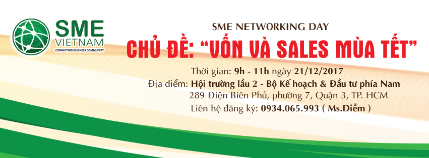 | Buổi họp mặt SME Networking Day kỳ 1 với chủ đề “Vốn và sales mùa tết” sẽ được tổ chức vào lúc 9h, ngày 21/12/2017 tại Hội trường (lầu 2) Bộ Kế hoạch và đầu từ phía Nam, 289 Điện Biên Phủ, Phường 7, Quận 3, TP. Hồ Chí Minh. Đăng ký TẠI ĐÂY: https://tinyurl.com/SME-Networking-Day |