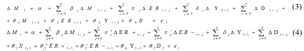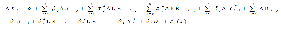 Tiếp theo, dựa theo nghiên cứu của Shin và cộng sự (2014), thay ER+ (đại diện cho đồng Việt Nam - VNĐ - giảm giá) và ER- (đại diện cho VNĐ tăng giá) vào phương trình (1) được phương trình (2) như sau: