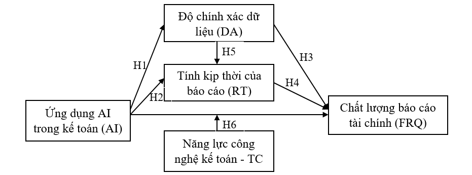 Dựa trên cơ sở Lý thuyết RBV, Mô hình FRQ và tổng hợp các nghiên cứu trước (Barney, 1991; Davenport và Ronanki, 2018; Zhang và Da, 2022), nghiên cứu này đề xuất mô hình nghiên cứu thể hiện mối quan hệ giữa mức độ Ứng dụng trí tuệ nhân tạo trong kế toán (AI Adoption - AI), Độ chính xác dữ liệu (Data Accuracy - DA) và Tính kịp thời của báo cáo (Reporting Timeliness - RT) với Chất lượng báo cáo tài chính (Financial Reporting Quality - FRQ). Năng lực công nghệ kế toán (Technological Capability - TC) được giả định đóng vai trò điều tiết (moderating) trong mối quan hệ giữa Ứng dụng trí tuệ nhân tạo trong kế toán (AI) và Chất lượng báo cáo tài chính (FRQ).