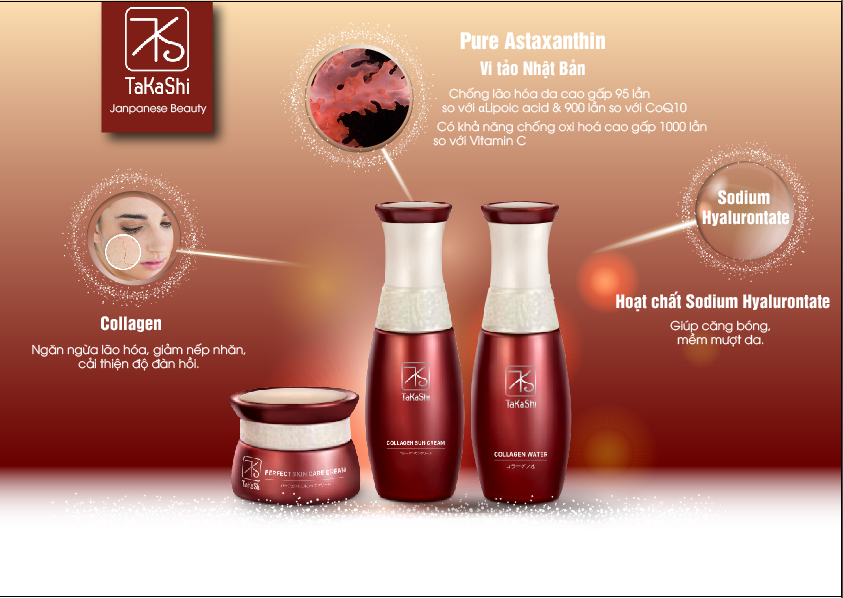 Với thành phần nguyên liệu từ vi tảo biển Nhật Bản, collagen và hoạt chất Sodium. Bộ ba sản phẩm Takashi bao gồm Takashi Collagen Water, Takashi Collagen SunCream và Takashi Perfect Skin Care Cream có tác dụng trong việc ngăn ngừa lão hóa da hiệu quả, đẩy lùi nếp nhăn, vết chân chim trên da và làm tăng khả năng đàn hồi, giúp da căng bóng và trắng sáng