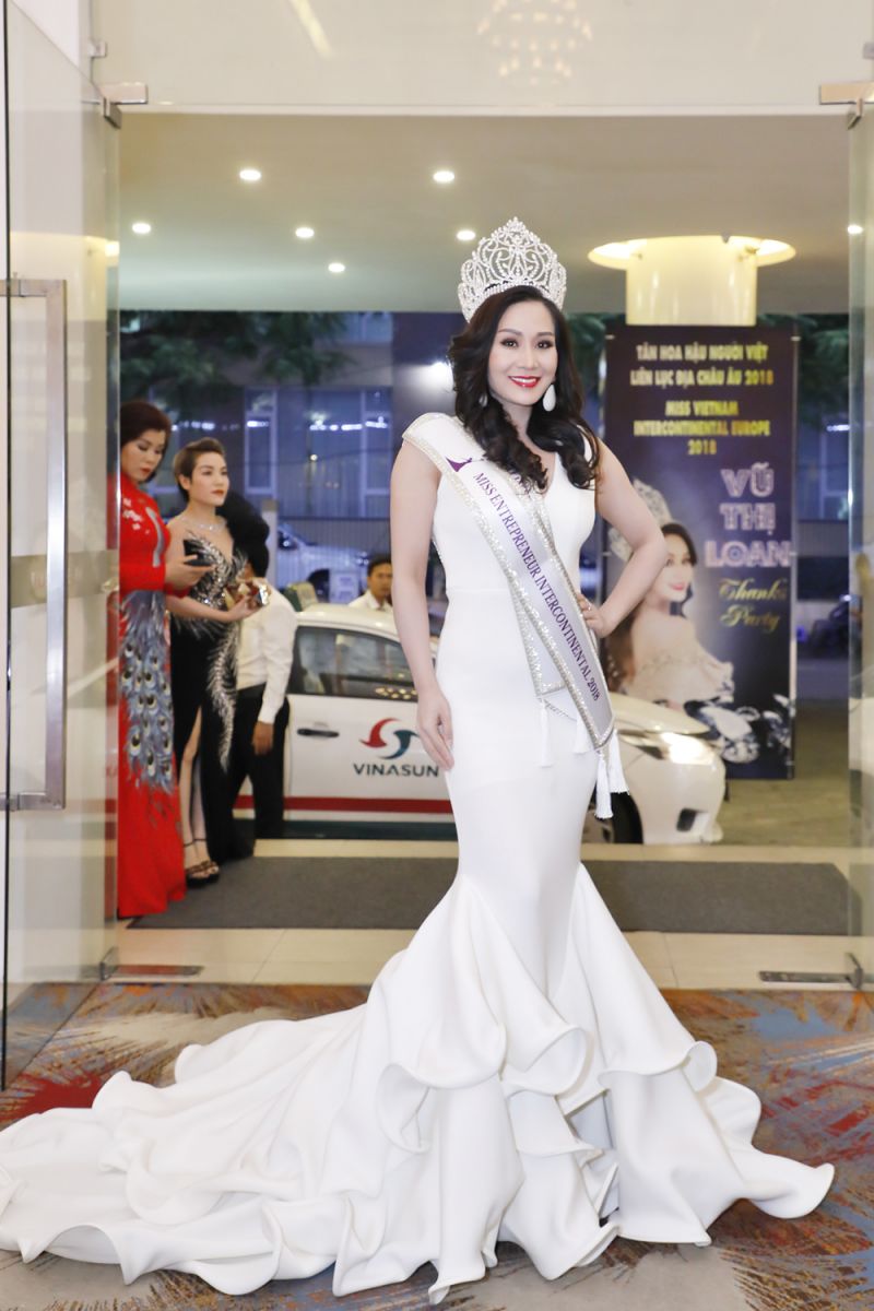 Diện 2 trang phục dạ hội lộng lẫy trong đêm tiệc, Vũ Thị Loan vô cùng rạng rỡ và xinh đẹp bởi nhan sắc mặn mà của bà chủ tiệm Spa và niềm hạnh phúc khi thắng lớn tại cuộc thi Hoa hậu lần này. Có thể nói đây là chiến tích rất đáng tự hào khi người đẹp đã vượt qua nhiều đối thủ nặng ký khi tham gia đấu trường nhan sắc tại Paris.