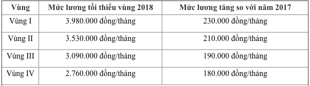 Theo quy định tại Nghị định số 141 quy định mức lương tối thiểu vùng đối với người lao động làm việc theo hợp đồng lao động, từ năm 2018, mức lương tối thiểu vùng áp dụng đối với người lao động làm việc tại các doanh nghiệp đã được điều chỉnh tăng lên từ 180.000-230.000 đồng/tháng tùy theo từng vùng so với năm 2017.