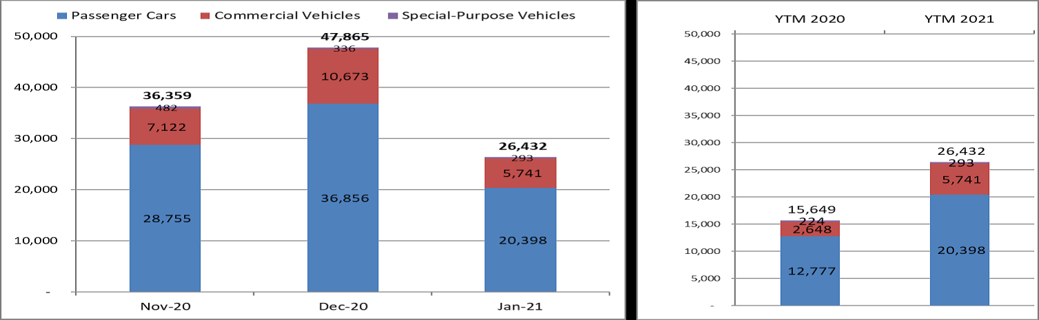 Cụ thể là, trong tháng 01/2021, sản lượng tiêu thụ ô tô toàn thị trường đạt 26.432 xe, bao gồm: 20.398 xe du lịch, giảm 45% so với tháng trước; 5.741 xe thương mại, giảm 46% và 239 xe chuyên dụng, giảm 13% so với tháng trước. Trong khi đó, sản lượng của xe lắp ráp trong nước đạt 14.512 xe, giảm 51% so với tháng trước và số lượng xe nhập khẩu nguyên chiếc là 11.920 xe, giảm 35% so với tháng trước.