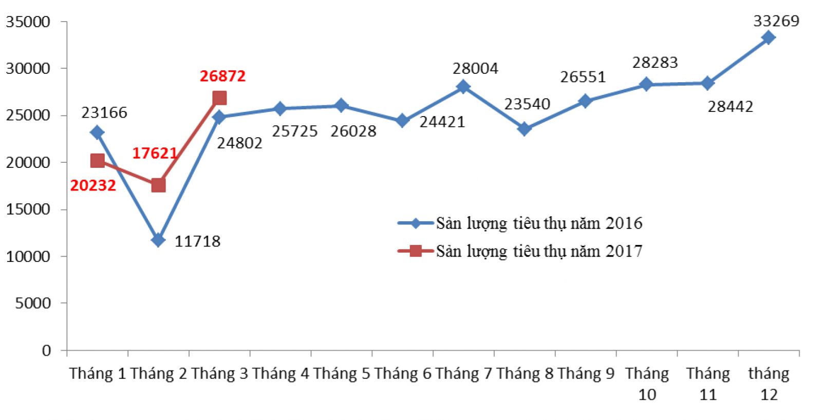 | Biểu đồ: Sản lượng tiêu thụ ô tô toàn thị trường năm 2016 và tháng 01, 02, 03/2017 |