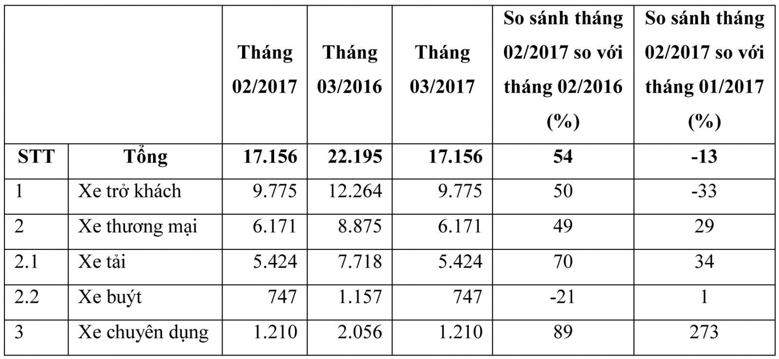 Trong tổng doanh số bán hàng của toàn thị trường tháng 03/2017, sản lượng tiêu thụ xe du lịch đạt 16.805 chiếc, tăng 23%; Xe thương mại đạt 8.278 chiếc, giảm 10%; Xe chuyên dụng đạt 1.789 chiếc, giảm 13% so với cùng kỳ năm 2016.