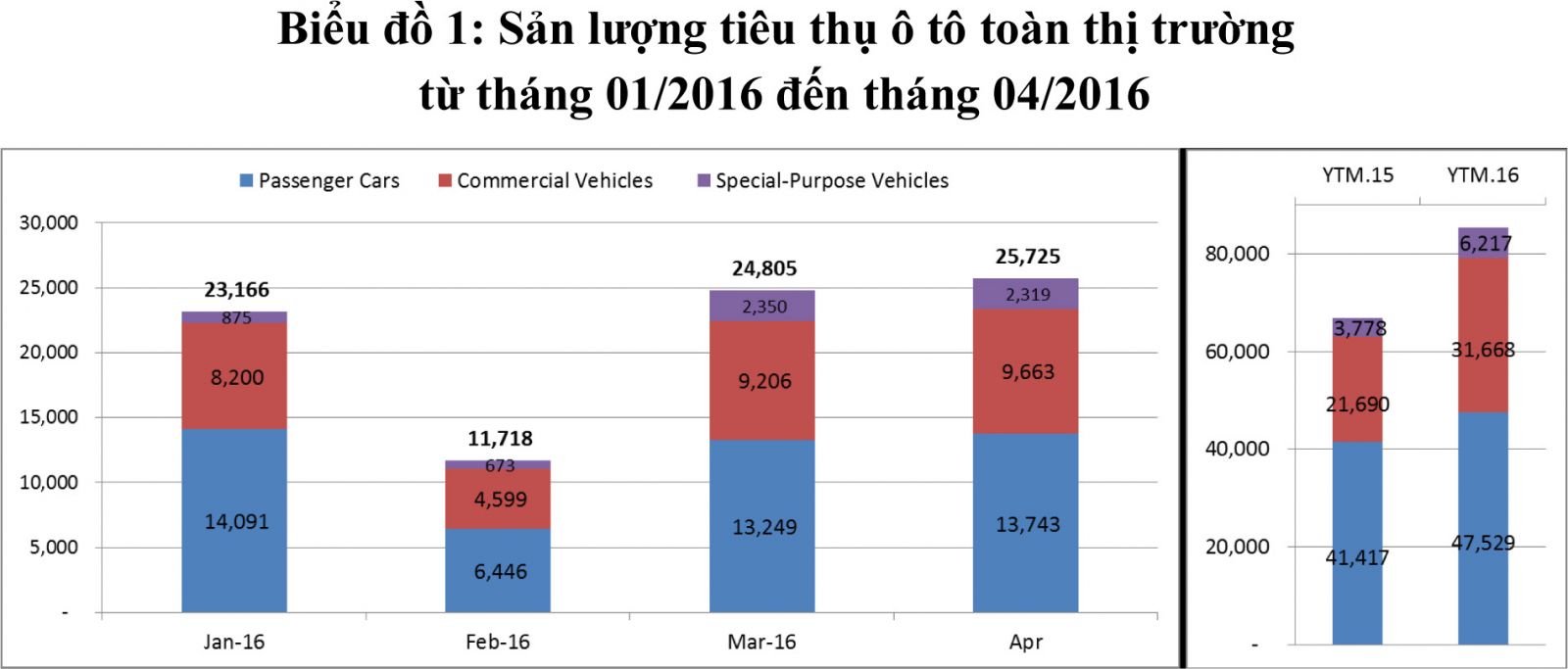 Cụ thể là, trong tháng 04/2016, sản lượng tiêu thụ toàn ngành ô tô đạt mức 27.725 chiếc, tăng 42% so với cùng kỳ năm 2015 và tăng 4% so với tháng 03/2016. Sản lượng tiêu thụ của từng chủng loại như sau: Xe du lịch đạt 13.743 chiếc, tăng 15% so với cùng kỳ năm 2015 và tăng 3,7% so với tháng trước; Xe thương mại đạt 9.663 chiếc, tăng 46% so với cùng kỳ năm 2015 và tăng 5% so với tháng trước; Xe chuyên dụng đạt 2.319 chiếc, tăng 65% so với cùng kỳ năm 2015 và giảm 1,3% so với tháng trước (Biểu đồ 1)