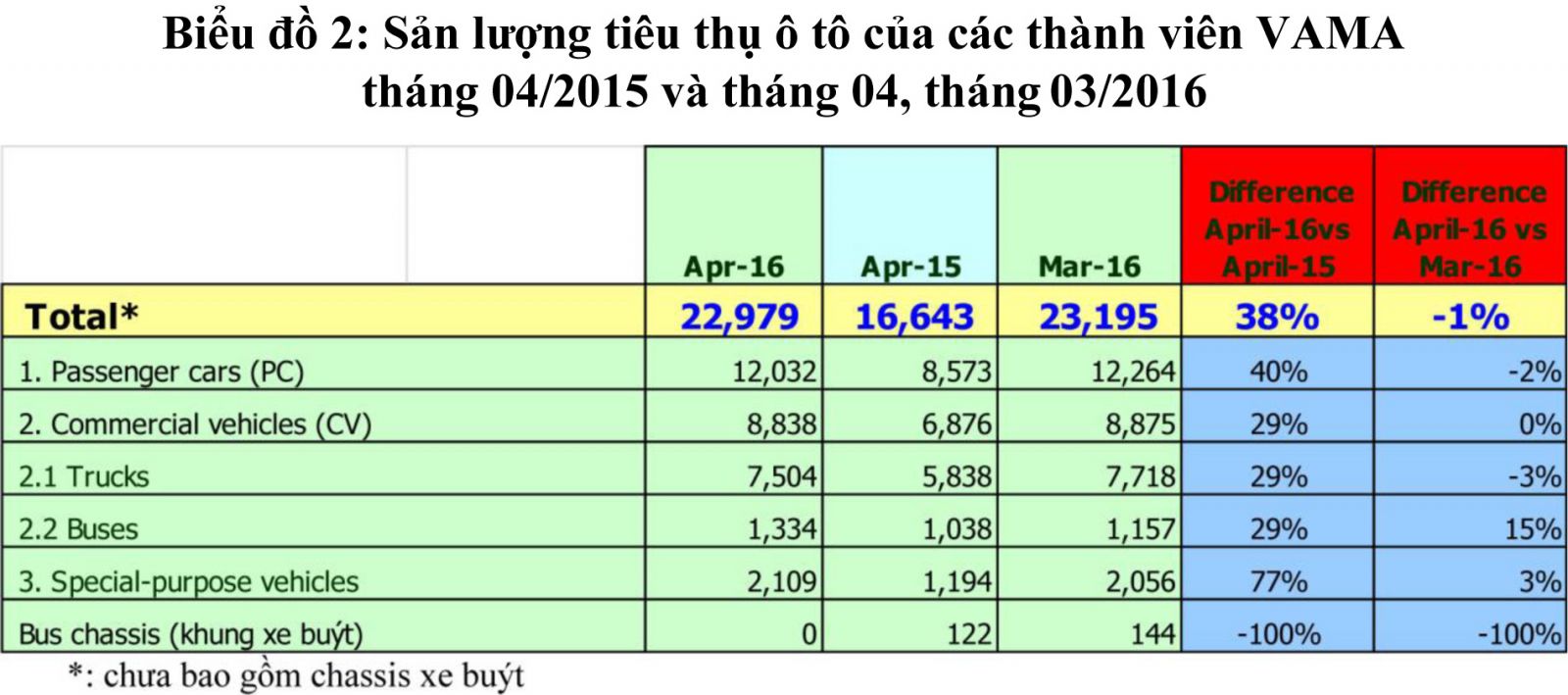 Đối với các thành viên VAMA, trong tháng 04/2016, sản lượng tiêu thụ đạt 22.979 chiếc, tăng 38% so với cùng kỳ năm 2015, nhưng cũng giảm 1% so với tháng trước (Biểu đồ 2).