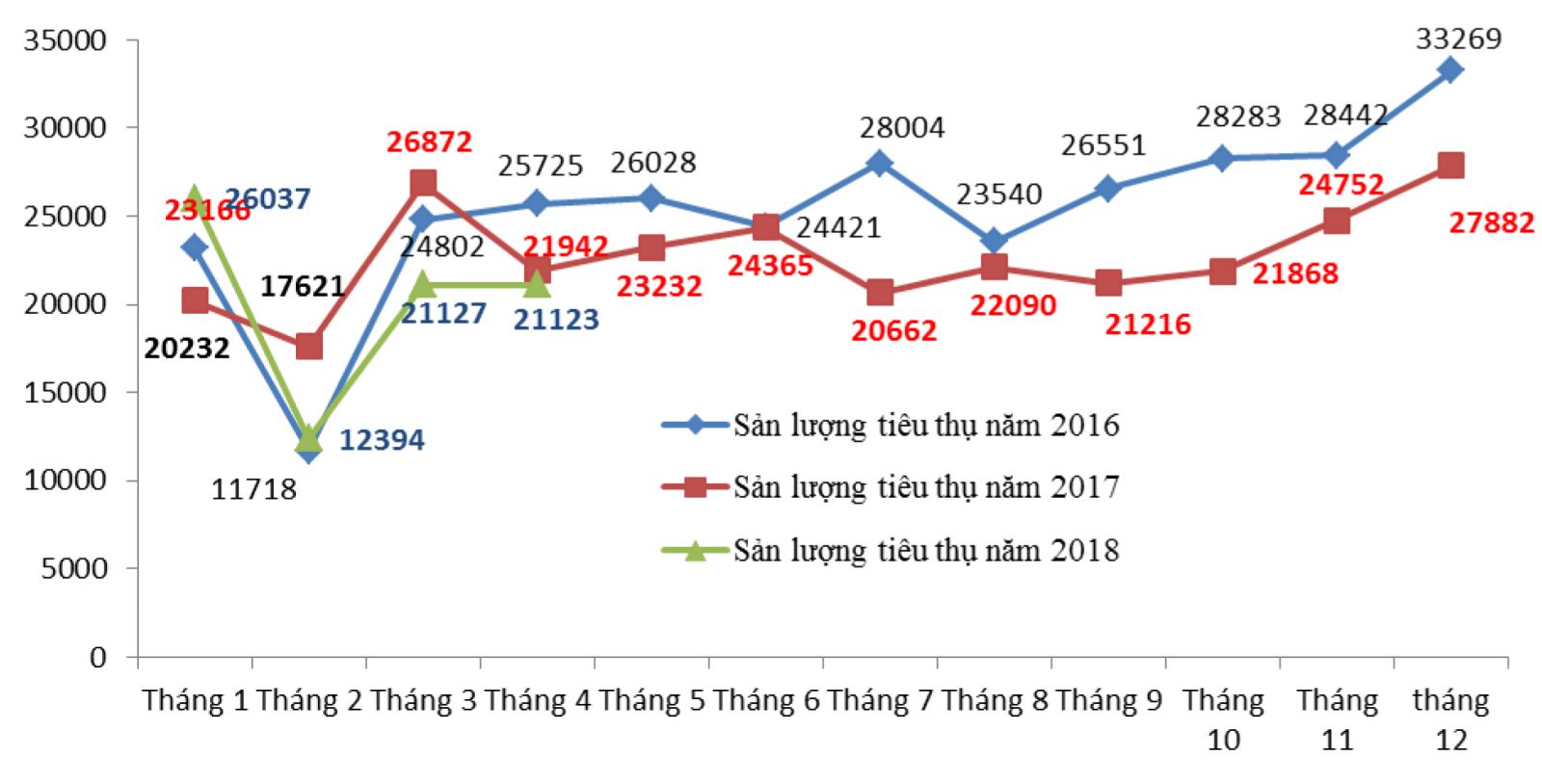 | Biểu đồ: Sản lượng tiêu thụ ô tô toàn thị trường năm 2016, năm 2017 và tháng 4/2018 |