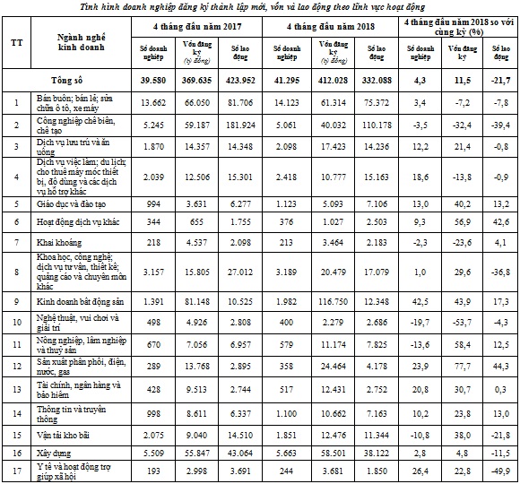 Cũng theo thông tin từ Cục Quản lý Đăng ký Kinh doanh (Bộ Kế hoạch và Đầu tư), trong 4 tháng đầu năm 2018, tổng số doanh nghiệp thành lập mới và doanh nghiệp quay trở lại hoạt động của cả nước là 52.737 doanh nghiệp, trong đó: có 41.295 doanh nghiệp thành lập mới, với số vốn đăng ký là 412.028 tỷ đồng, tăng 4,3% về số doanh nghiệp và tăng 11,5% về số vốn đăng ký so với cùng kỳ năm 2017.