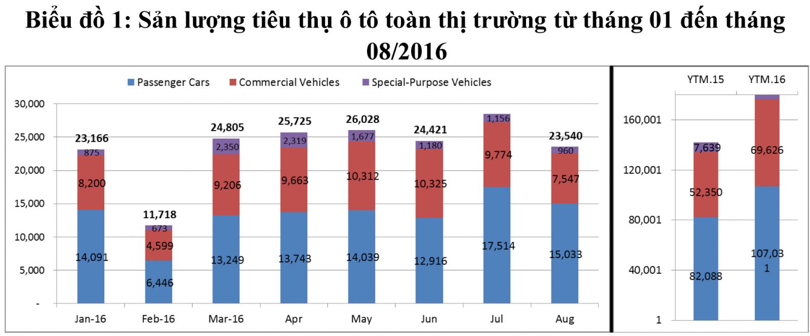 Cụ thể là, trong tháng 08/2016, sản lượng tiêu thụ toàn ngành ô tô đạt mức 23.540 chiếc, tăng 29% so với cùng kỳ năm 2015, nhưng giảm 17% so với tháng 07/2016. Sản lượng tiêu thụ của từng chủng loại như sau: Xe du lịch đạt 15.033 chiếc, tăng 30% so với cùng kỳ năm 2015 và giảm 14% so với tháng trước; Xe thương mại đạt 7.547 chiếc, tăng 33% so với cùng kỳ năm 2015 và giảm 22% so với tháng trước; Xe chuyên dụng đạt 960 chiếc, tăng 46% so với cùng kỳ năm 2015 và giảm 17% so với tháng trước (Biểu đồ 1).