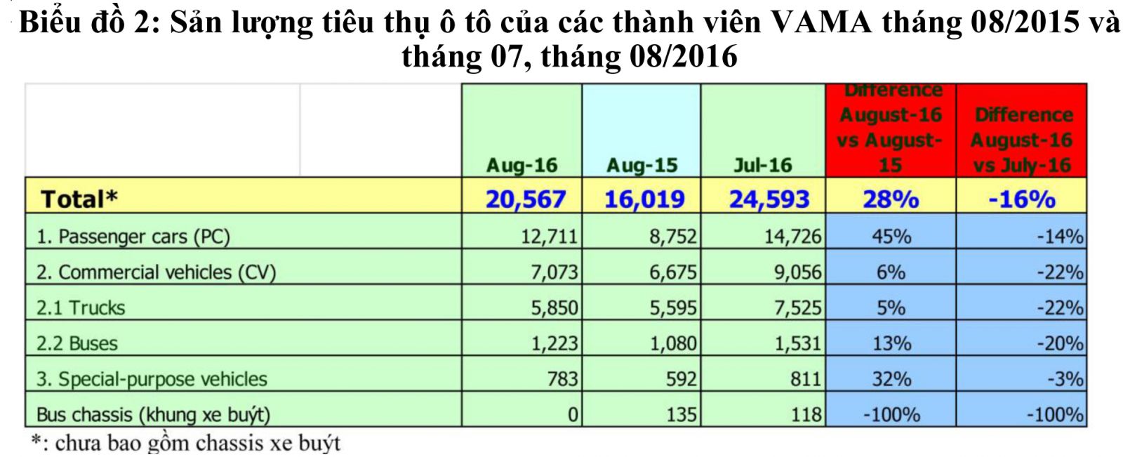 Đối với các thành viên VAMA, trong tháng 08/2016, sản lượng tiêu thụ đạt 20.567 chiếc, tăng 28% so với cùng kỳ năm 2015 và giảm 16% so với tháng trước (Biểu đồ 2).