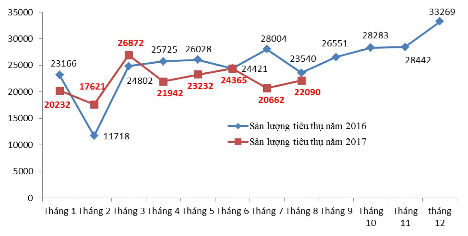 Cụ thể là 08 tháng đầu năm 2017, sản lượng tiêu thụ ô tô toàn thị trường đạt 144.840 chiếc, giảm 6% so với cùng kỳ năm 2016. Trong đó, sản lượng tiêu thụ xe ô tô du lịch giảm 4%; xe thương mại giảm 7% và xe chuyên dụng giảm 17% so với cùng kỳ năm 2016. Tính đến hết tháng 8/2017, doanh số bán hàng của xe lắp ráp trong nước giảm 11%, trong khi xe nhập khẩu tăng 10% so với cùng kỳ năm ngoái.