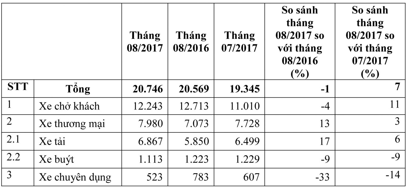 Đối với các thành viên VAMA, trong tháng 08/2017, sản lượng tiêu thụ đạt 20.746 chiếc, tăng 1% so với cùng kỳ năm 2016 và tăng 7% so với tháng trước (Bảng).