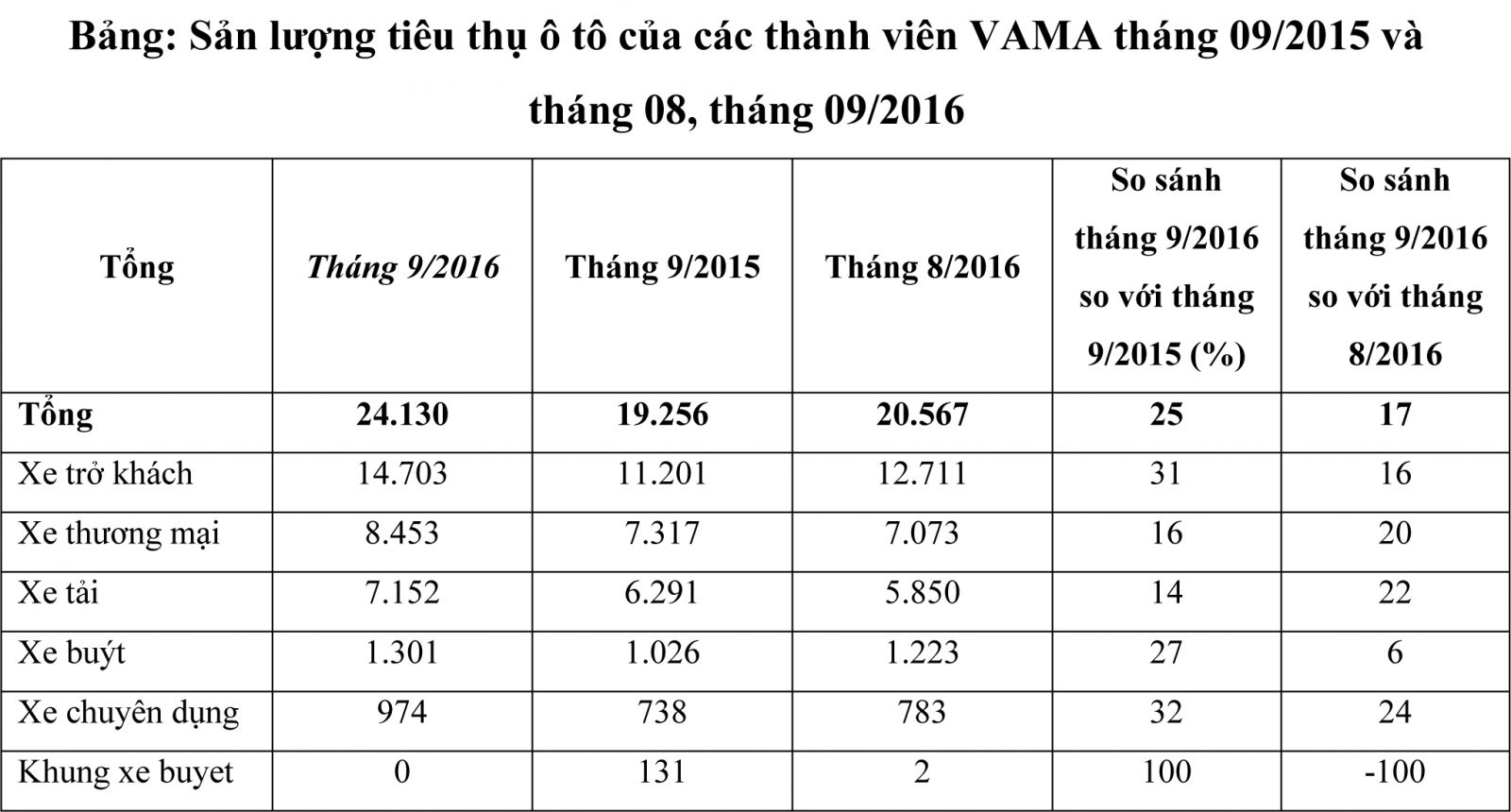 Đối với các thành viên VAMA, trong tháng 09/2016, sản lượng tiêu thụ đạt 24.130 chiếc, tăng 25% so với cùng kỳ năm 2015 và tăng 76% so với tháng trước (Bảng).