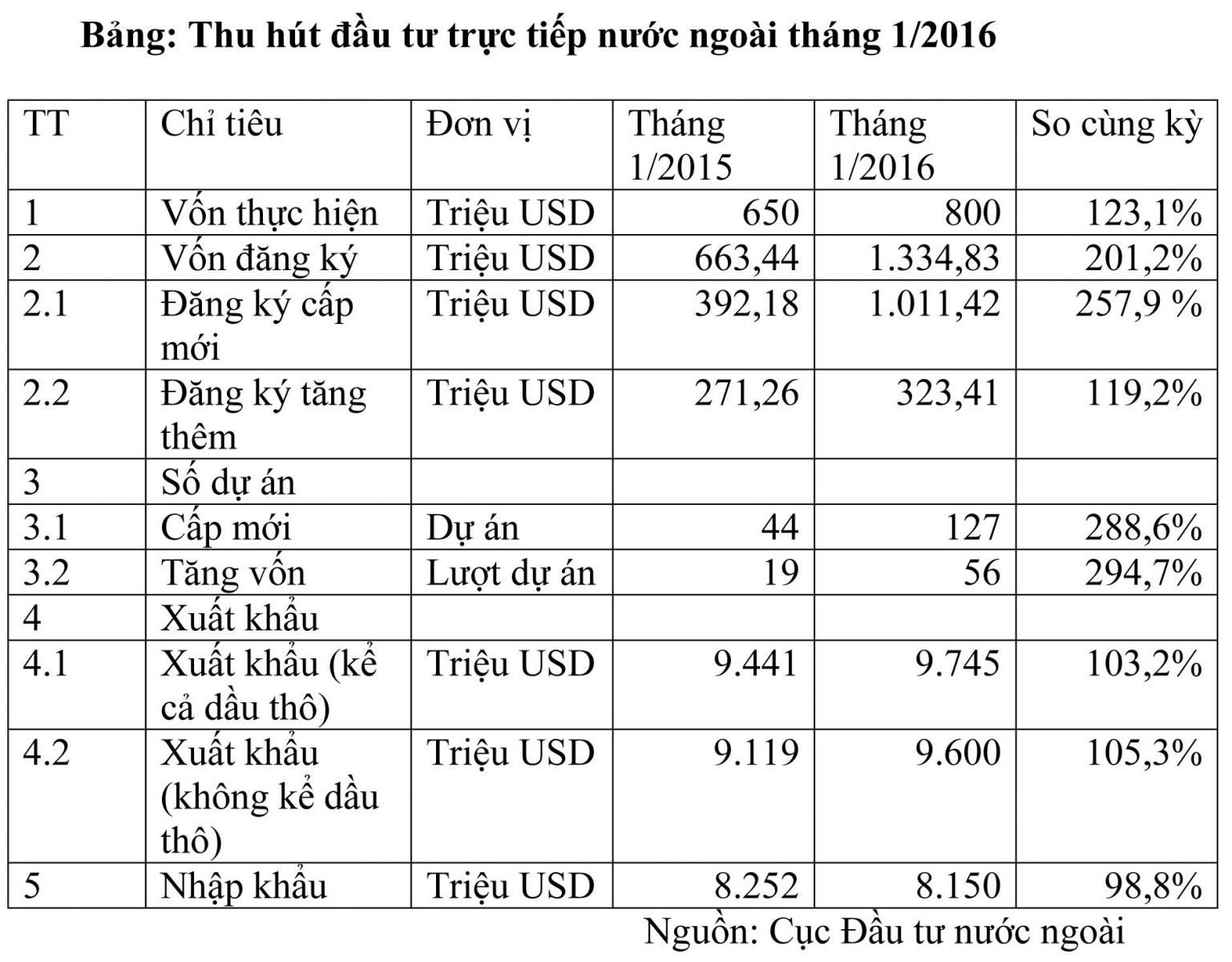 Tính đến ngày 20/01/2016, ước tính các dự án đầu tư trực tiếp nước ngoài đã giải ngân được 800 triệu USD, tăng 23,1% so với cùng kỳ năm 2015.